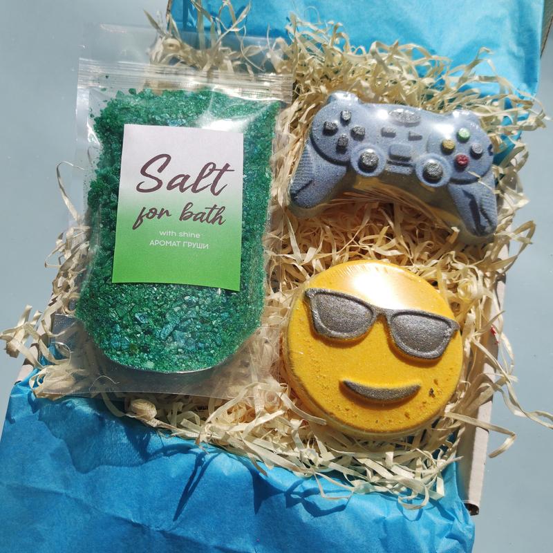 Подарочный набор "Smile & Play" -- эмоции, игра и ароматный релакс в одной коробке! Этот набор создан для тех, кто любит веселиться, играть и получать удовольствие даже в ванной! Яркий смайлик и геймпад задают настроение, а ароматная соль с шиммером превращает купание в настоящее SPA-приключение. 💙 В набор входит: 🎮 Бомбочка «Геймпад» -- с ароматом леденцов, 85 г 😎 Бомбочка «Смайлик в очках» -- с ароматом банана, 90 г 💦 Соль для ванны с шиммером -- аромат на выбор из ассортимента (на 2 применения) 🎁 Подарочная упаковка: плотная белая коробка, древесная стружка, бумага тишью, яркая лента, конфетти-звёздочки 💌 Открытка -- на выбор ✅ Преимущества набора: • Натуральная косметика ручной работы • Яркий, стильный дизайн для мальчиков и подростков • Безопасные красители -- не окрашивают кожу и ванну • Свежие ароматы, много пены, блестящий shimmer-эффект • Подходит детям от 3 лет • Уже упакован -- идеален для подарка 🎉 Идеальный подарок для мальчика, сына, внука или друга -- на день рождения, Новый год, Святого Николая или просто для хорошего настроения. Пусть ванна станет местом для веселья и отдыха!