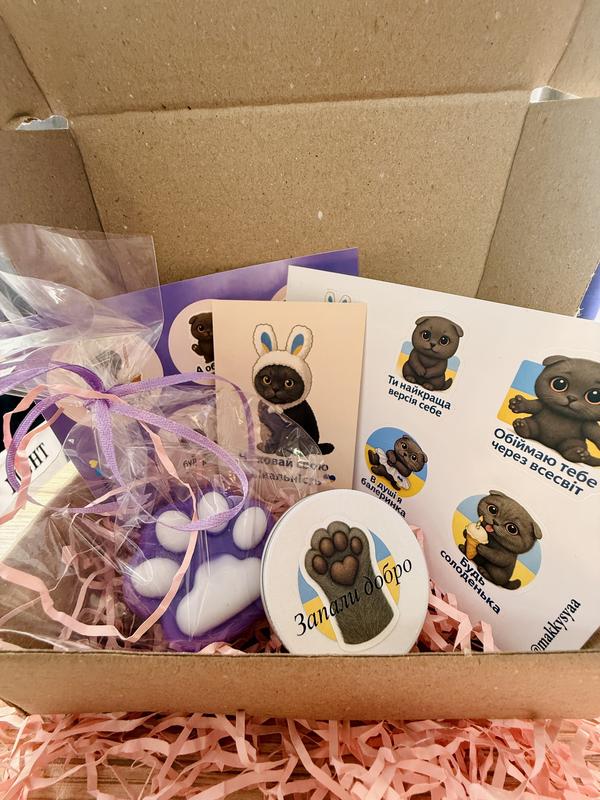 це наш Мяу Бокс в середині. Складова : 2 стікер паки на вибір еко свічка з запахом мʼяти 30 мл листівка на вибір Лапка мило ручна робота, колір на вибір Та головне що 20% йде на підтримку Краматорского притулку