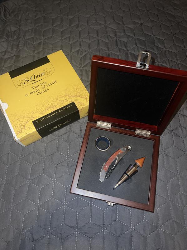Набір для вина, складається з каплеуловлювача, штопора і винний стопер. Новий набір. Чудовий подарунок. Дуже дорого виглядає. Коробка зроблена з дерева