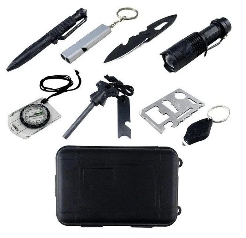 Туристичний набір інструментів для виживання 8 предметів У комплект входять: Ніж викидний Свисток Кресало Ручка з вольфрамової сталі Тактичний ліхтарик (батарея АА не входить до комплекту) Компас Портативний брелок-ліхтарик Карта виживання Ударостійкий кейс Для замовлень і запитань пишіть