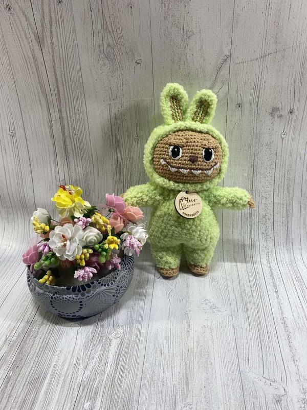 В'язана іграшка Лабубу. Ціна вказана за одну. В'язані іграшки ручної роботи з гіпоалергенних матеріалів абсолютно нешкідливі для здоров'я малюка і довго зберігатимуть свій бездоганний зовнішній вигляд. Ми із задоволенням виготовимо (вашу ідею) дизайнерську іграшку на замовлення будь-якого кольору, розміру, форми, героя... Подаруйте радість з нашим унікальним, оригінальним, неповторним шедевром ручної роботи, виготовленим з любов'ю і душею.