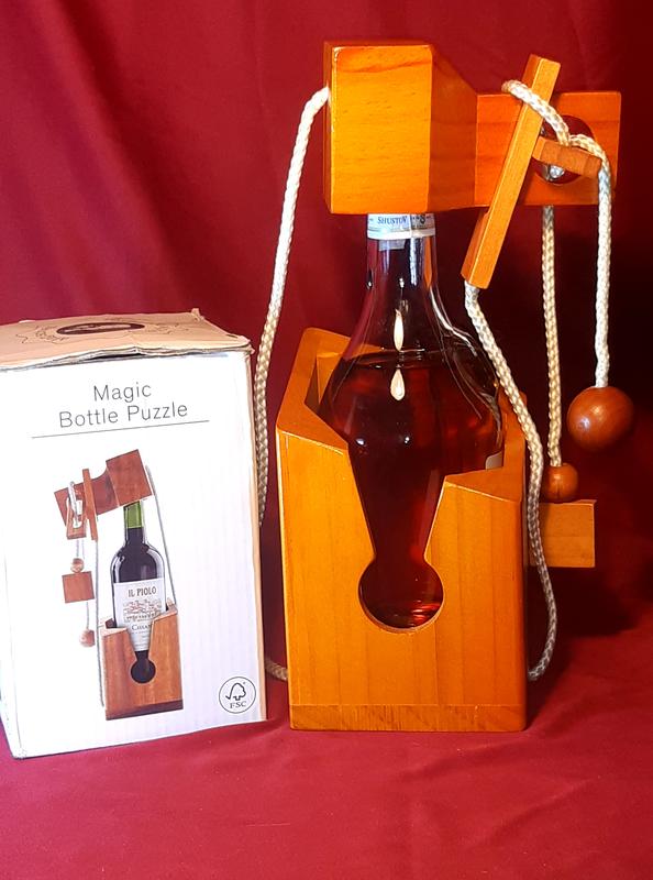 Увлекательная головоломка заставит нервничать даже самых самонадеянных людей. Загвоздка в том, что, казалось бы, простая задача – высвободить бутылку из конструкции, состоящей из пары деревяшек и веревок, не так уж просто решается. С ней справиться может только тот, кто знаком с инструкцией по распутыванию этого хитросплетения или человек с мощным аналитическим интеллектом. Испытай себя – попробуй разгадать секрет этой головоломки.)