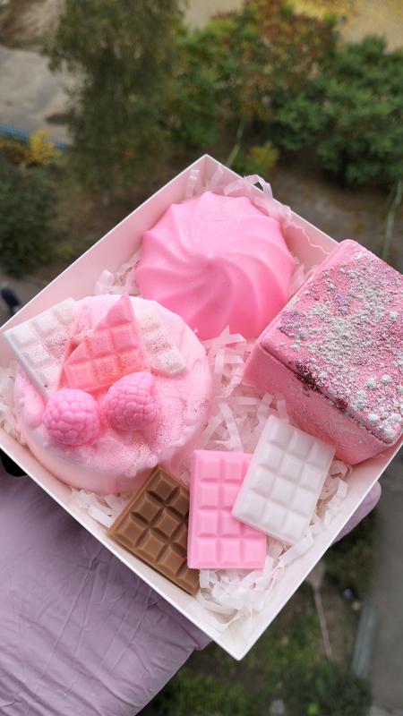 Ніжний подарунковий набір ручної роботи 💖 Усередині: бомбочка квадрат з блиском, мило “пирожиночка”, мило “зефір” та мило у вигляді плитки шоколаду 🍫 Ароматна турбота для душі 💕 Ідеально підходить як подарунок для дівчини, подруги, мами 🎁 Усе в подарунковому пакуванні з листівкою 💌 Вартість — 380 грн