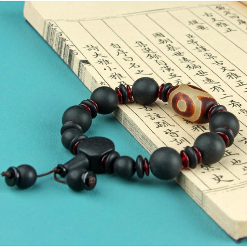 Браслет дзі 3 очі матовий чорний обсидіан із пензликом, браслет із намистиною дзи, намисти...