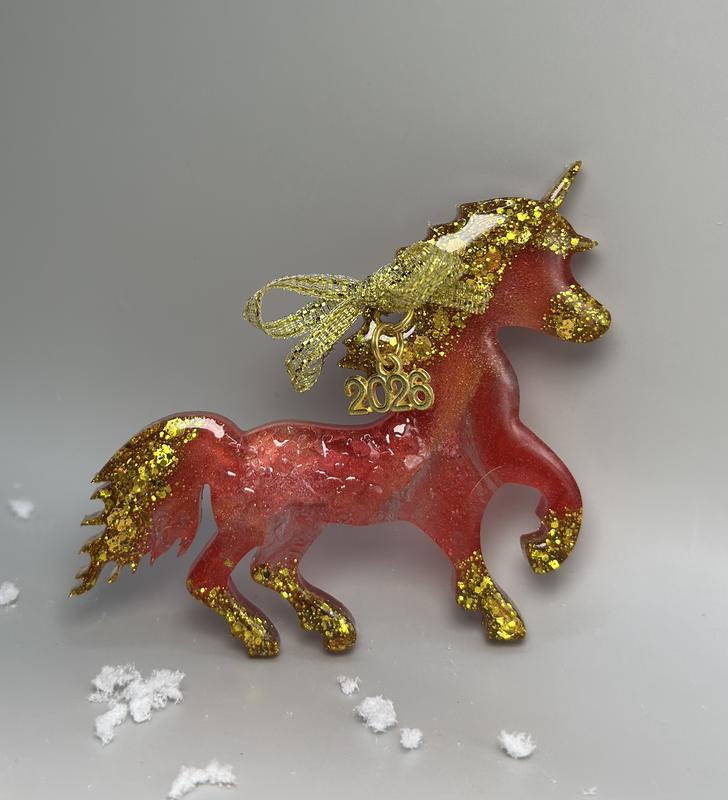 Handmade В работе использованы материалы: эпоксидная смола, камушки, сияющие блестки, лента парчевая, неодимовый магнит, декоративная подвеска. Размер: высота 7 см, ширина 7.5 см. Символ Нового года 2026 *Огненный конь*.