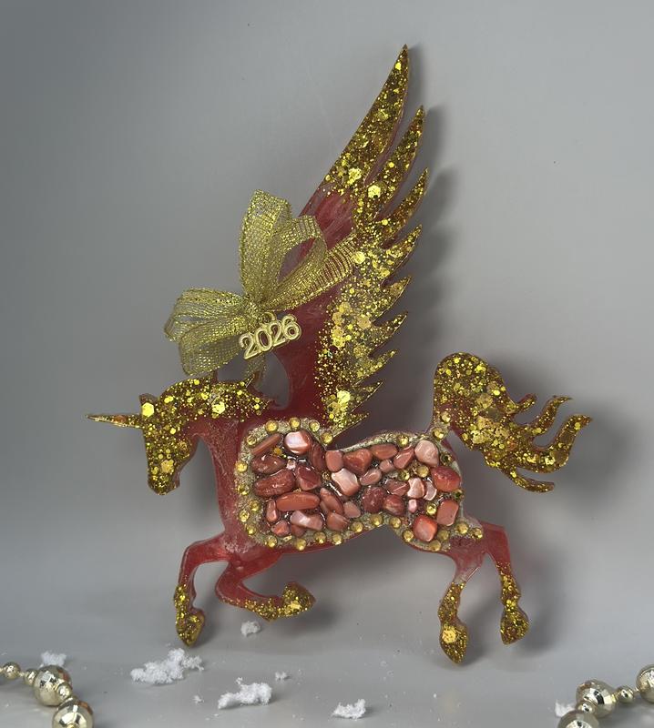 Handmade У роботі використані матеріали: епоксидна смола, камінці, стрази, сяючі блискітки, стрічка парчева, неодимовий магніт, декоративна підвіска. Розмір: висота 15.5 см, ширина 9.5 см. Символ Нового року 2026 *Вогняний кінь*.