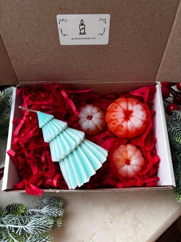 🎁 Подарунковий набір "Новорічна магія" - свічка та мило ручної роботи 🎄 Чудовий святковий набір, який подарує атмосферу тепла та затишку. Ідеальний варіант подарунка для близьких, друзів або колег! 🔹 У набір входить: - 🕯 Свічка ручної роботи у вигляді ялинки - стильний зимовий дизайн, приємний аромат, створює справжнє новорічне диво. - 🍊 3 шт. мила "Мандаринка" ручної роботи - ароматні, яскраві, у формі соковитого мандарина. Натуральний склад і ніжне очищення. 📦 Естетична подарункова упаковка з декоративним наповнювачем. ✨ Ідеально підходить: - для подарунка на Новий рік, Різдво - для святкового декору - для створення новорічного настрою 🔸 Ручна робота 🔸 Натуральні компоненти 🔸 Обмежена серія