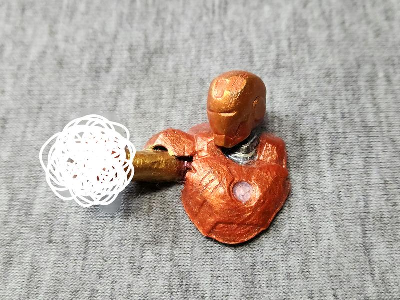 Залізна людина без магнітів, що втратила руку. Це незакінчена печатка, яка була адаптована у фігурку постраждалого персонажа. Прикрашена акрилом. Ця фігурка підійде для створення діорами. Розміри Д-Ш-В: 42х34х32мм
