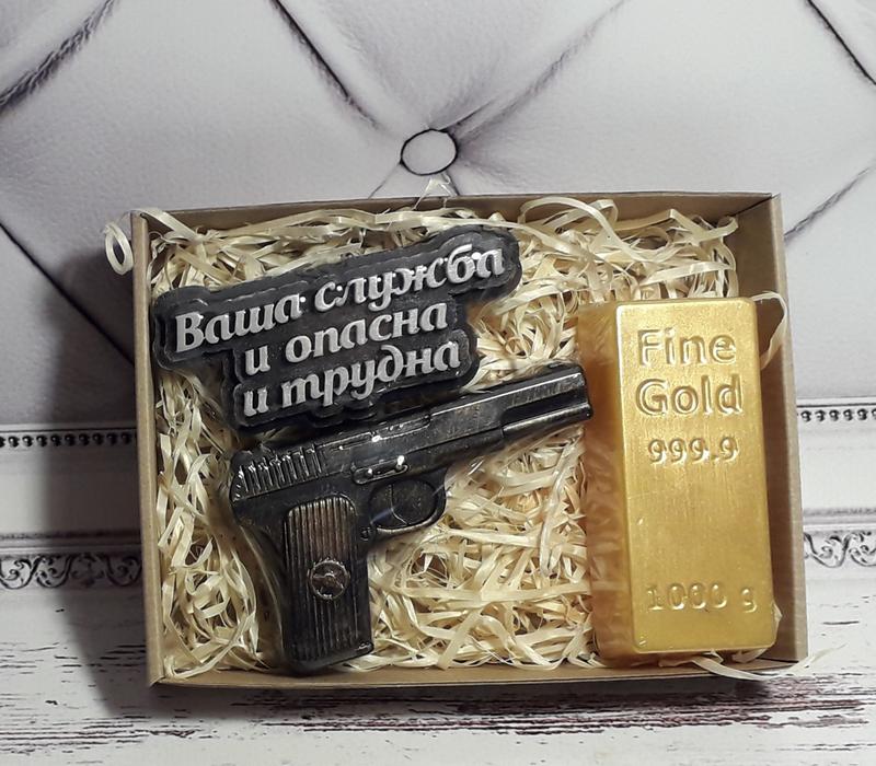 Подарочный набор сувенирного мыла ваша служба и опасна и трудна, пистолет, слиток мыло руч...