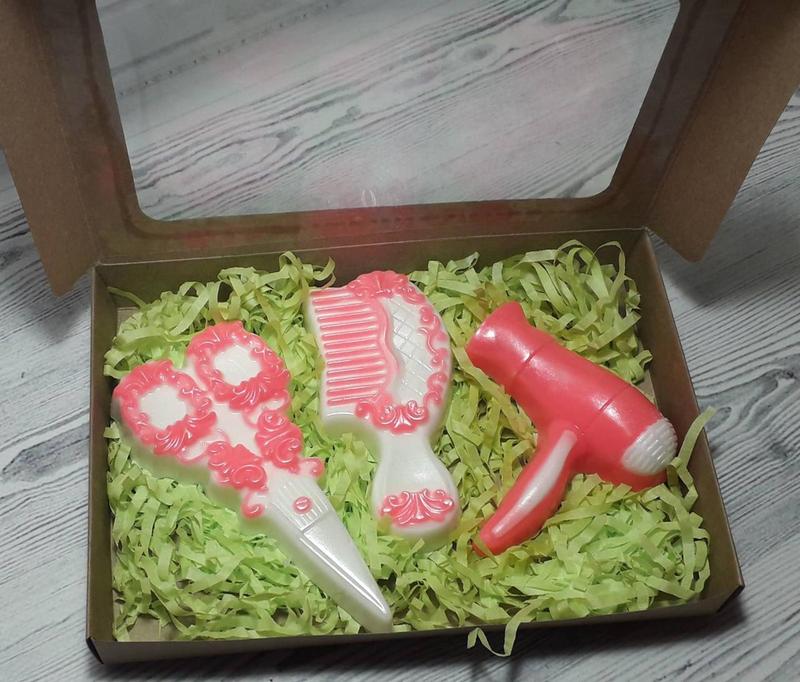 Подарунковий набір сувенірного мила ножиці, гребінець, фен (в коробочці) мило ручної робот...