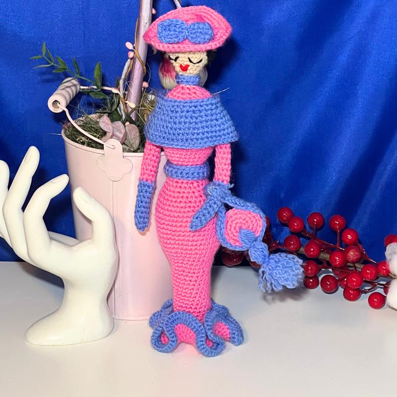 Вязанная игрушка ручной работы, кукла в розово-синем платье, 28 см, ms1