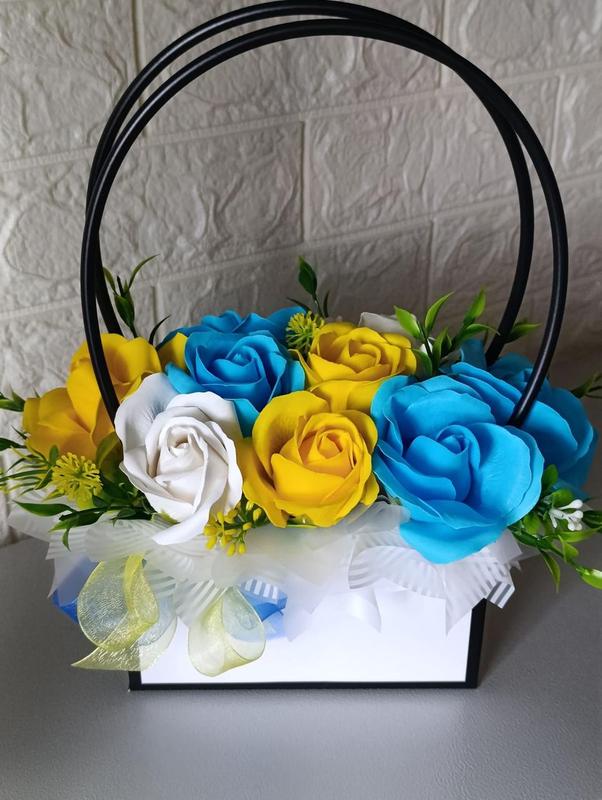 Композиция с мыльными цветами. Цветы сделаны из пены мыла, имеют приятный цветочный аромат, сохраняется до 5 лет, в уходе не нуждаются.