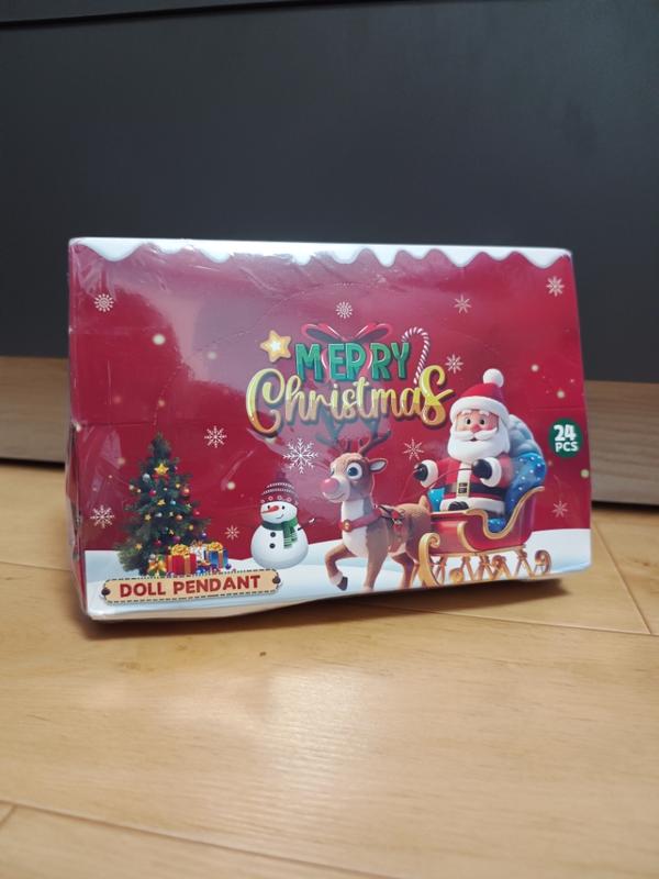 24 маленьких подарка новогодняя тематика в отдельных коробочках к ним прилагаются цепочки, так что можно вешать на елочку в качестве елочных украшений или использовать как брелок.