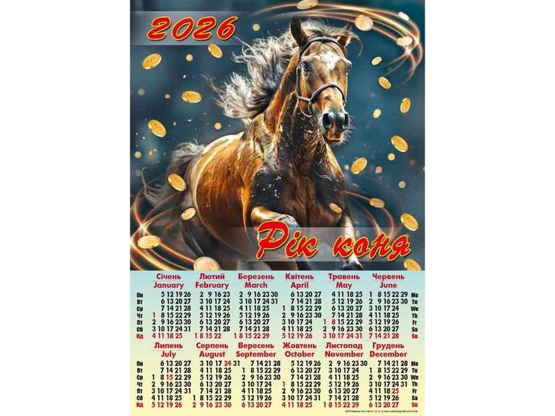 Листовий календар плакат А2 формату на 2026 рік українською та англійською мовами. Розмір: 620x430мм.