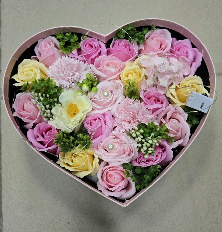 Троянди з мила у коробці у формі серця розов