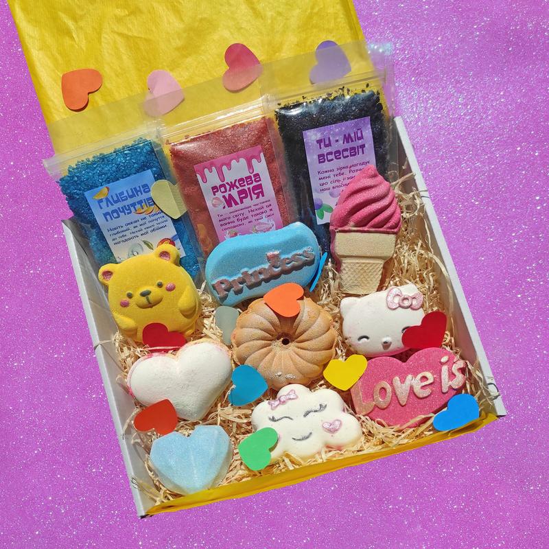 Подарочный набор бомбочек для ванны и мерцающего шиммера станет оригинальным подарком как на день рождения, так и на сюрприз для разных праздников. Легко удивите девушку, жену, любимую или ребенка! В восторге будут и дети, и взрослые. Меняйте цвета шиммера в наборе, дополняйте милой открыткой, а мы отправим готовый к вручению презент. Полезные домашние Spa могут быть яркими и сияющими! Разнообразие шипучек в наборе делает каждое принятие ванны неповторимым. Вкусные ароматы, насыщенные цвета, пенное растворение, сияние - все это в одном подарке! 🌈 Красочное и шипучее растворение 🌿 Заботливый и натуральный состав 🌸 Свежая косметика Handmade 🎁 Особенный подарок на любой случай Вы дарите полноценных 15 Spa-вечеров ухода за собой, релакса и вдохновения. Наполнение подарочного набора актуально в любое время года и универсальное для многих событий. Срок годности от 160 до 250 дней, аромат и состав каждого изделия на этикетках. Использовать можно детям от 3х лет. В подарочный набор входит большие бомбочки: - Медвежонок -- с ароматом печенья, 105 г - Принцесса -- с шиммером и ароматом леденцов, 120 г - Секретное сердце -- внутри спрятано 3 цвета, фруктовый аромат, 130 г - Бомбочка-мороженое -- с ароматом клубничной сливки, 105 г - Зефирный золотой пончик -- с ароматом ванильной груши, 130 г - Hello Kitty -- фруктовый аромат, при растворении появляется фиолетовый цвет, 90 г - Love is -- с ароматом вишни, 105 г - Хрустальное сердце -- с ароматом манго, 75 г - Милая тучка -- с фруктовым ароматом, внутри спрятано 3 цвета 100 г - 3 шт Шиммер-соль для ванны с посланиями или без (на выбор) на 6 🛁 Разновидность шиммеров укажите в комментариях или при подтверждении заказа менеджером.