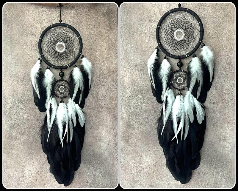 Ловец снов чёрно-белый, диаметр 16 см, длина 60 см, с паутинкой чёрного цвета и элементами белой нити, которая светится в темноте — эффектный декоративный оберег. Контраст чёрной паутинки и светящейся белой нити создаёт динамичный и мистический эффект: в светлое время суток ловец выглядит элегантно и стильно, а в темноте мягко сияет, наполняя пространство атмосферой магии. Большой размер и длина делают его заметным акцентом в интерьере: идеально для дома, студии или спальни. Такой ловец снов — уникальный, современный и атмосферный оберег, который объединяет стиль, магию и уют.