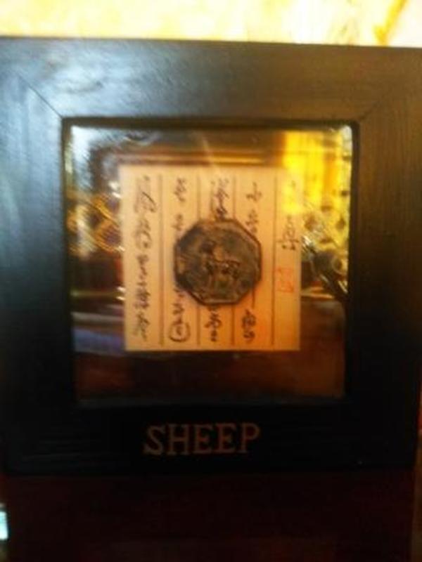 Сувенір. Оберіг і побажання щастя народженому в рік Кози. Медальйон і рисовий папір з побажаннями, укладені під скло в дерев'яній рамці.