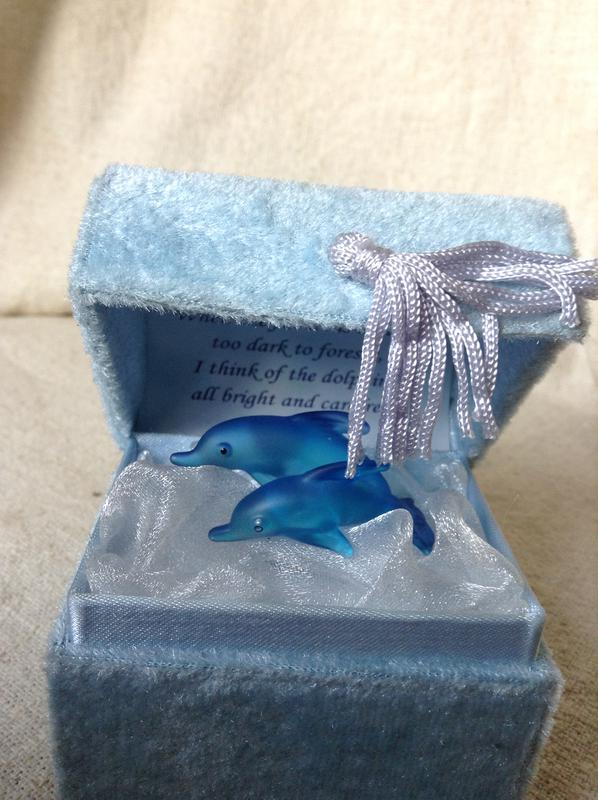 Статуетка з венеціанського скла.Це справжнє втілення вишуканості та пишноти.Довжина дельфінів 4.5 см. Вісь 18 грамів.Футляр із блакитного оксамиту.7 см-довжина, ширина та висота.