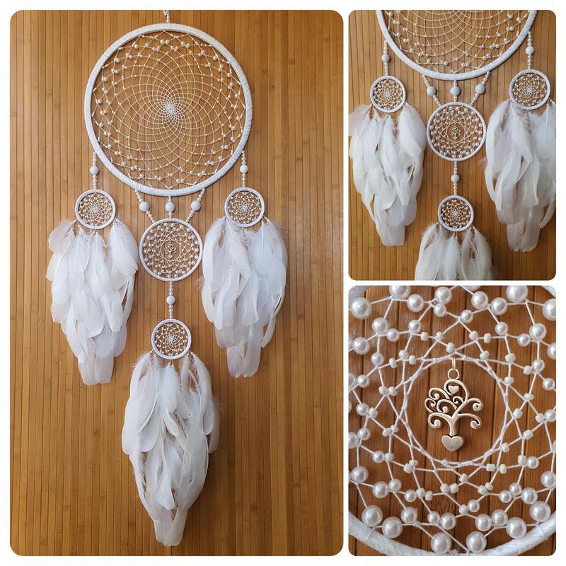 Большой белоснежный ловец снов станет центром Вашей спальни или декор фотозоны. Диаметр 40см длина 120см. Ловец снов не только оберег, но и создаёт приподнятое настроение и придаёт законченность интерьеру. Отличный и нетривиальный подарок для ваших родных и близких. Не смотря на то, что ловец снов имеет древнеиндийские корни, его не забыли и в сегодняшнее время, он очень популярный во многих странах мира. Современные любители экзотических предметов частенько украшают свои спальни подобным «защитником» и верят, что он не только выполняет декоративную функцию, но еще и защищает спящего человека