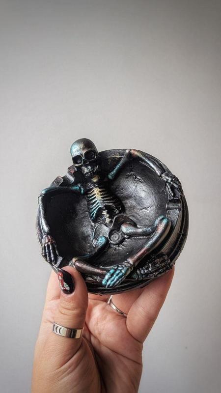Оригінальна попільничка у вигляді скелета, що відпочиває, -- це не лише функціональний виріб, а й справжній арт-об'єкт. Вона стане креативною деталлю інтер'єру та приверне увагу гостей своїм незвичайним дизайном. Ідеально підійде для тих, хто цінує стиль з ноткою іронії. Характеристики: - Матеріал: гіпс - Колір: різнокольоровий - Призначення: попільничка, інтер'єрний декор, подарунок