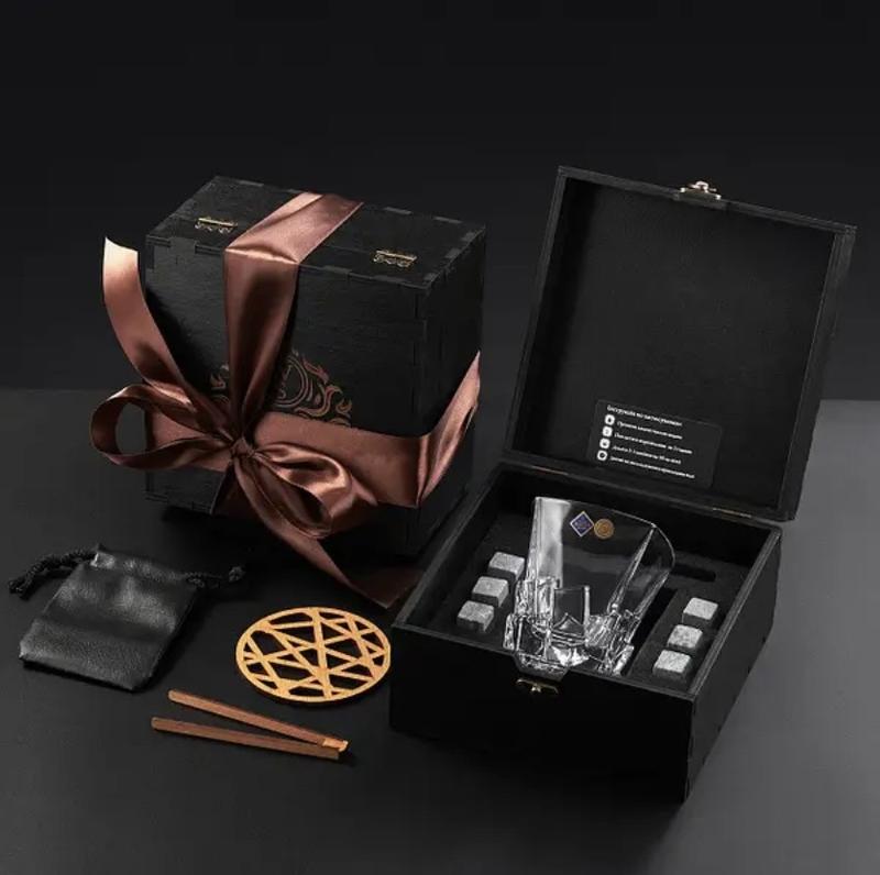 Хочете привітати чоловіка з святом? Камені для віскі в дерев'яній коробці, м'яким ложементом і келихом. А так само будь келих в комплекті. Відмінно підходить на подарунок директору, колезі, другу або чоловікові. Можемо зробити індивідуальне гравіювання. В ПОДАРУНКОВИЙ НАБІР ВХОДИТЬ: 1. Якісна дерев'яна подарункова упаковка 20 на 20 см на 11 см в темному дереві. Внутрішня частина - це м'який ложемент, в якому лежать оригінальні камені для віскі 6 шт, мішечок для каменів з екошкіри, келих на вибір, щипці і підставка під стакан. 2. Оригінальні американські Камені для охолодження віскі 6 шт . Камені призначені для охолодження віскі, охолоджують і не розбавляють його як лід. Камені оригінал із США. 3. Мішечок з екошкіри. Наші мішечки для віскі виготовлені з якісної екошкіра, яка імітує натуральну шкіру, але не тріскається від мінусової температури. Також ні в якому разі не рекомендуємо купувати набори з мішечками з натуральної тканини - вона натягує сторонні запахи і смаки з холодильника, також ворсинки потім потрапляють в віскі. 4. Стильний бокали для віскі Sterling, Bohemia Quadro або Bohemia Barline на вибір. 5. Дерев'яні щипці, які на відміну від металевих не подряпають і не зашкодять камінь. 6. Дерев'яний багаття (підставка)