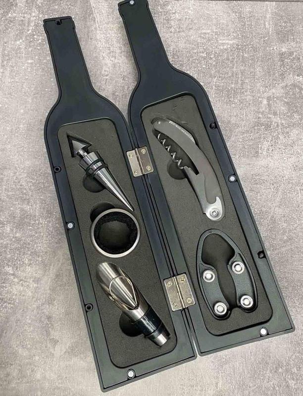 Набір для бара (набір сомельє) з неіржавкої сталі A-Plus 5-24 5WB Набір для бара чудовий подарунок для друзів, близьких людей або колег. Набір також підійде в домашньому використанні, щоб полегшити відкриття пляшки вина, а також полегшить розлив напою. Характеристика: Тип: Набір для бара Матеріал: Нержавіюча сталь Комплектація: Штопор (ніж сомельє), кільце для запобігання потраплянню вина на скатертина, дозатор із корком для полегшення розливання, корок для пляшки, відкривачка для полегшення відкривання пляшки Колір: Сталевої Особливості: Стильний дизайн Чудово підійде для подарунка Подарункове паковання