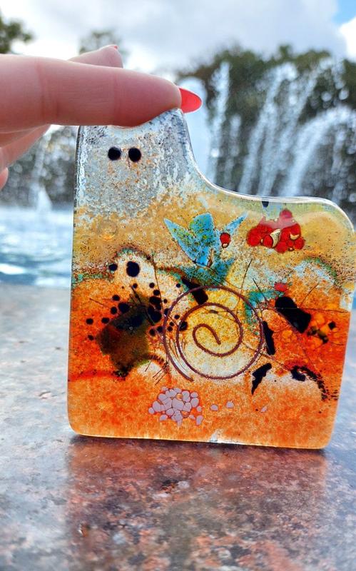 Вінтажна підставка під келих або кружку Котик із плавленого скла виготовлений вручну . Унікальний , яскравий дизайн із неймовірною деталізацією. Це «середземноморська» кольорова гама, ретельно сформований із зеленого, синього, помаранчевого та сріблястого скла, прикрашеного кольоровими вкрапленнями та центральним завитком.