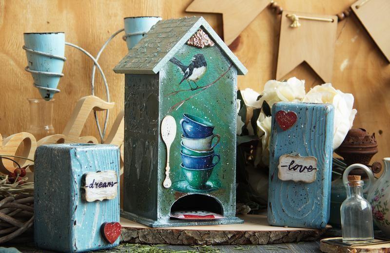 Когда на улице ненастье И неохота выходить То чашка чая- просто счастье И это счастье можно пить) Чайный домик в наличии. В комплект можно приобрести и подсвечники из сосны. Стоимость домика для чайных пакетиков - 400 грн Стоимость подсвечников - 350 грн