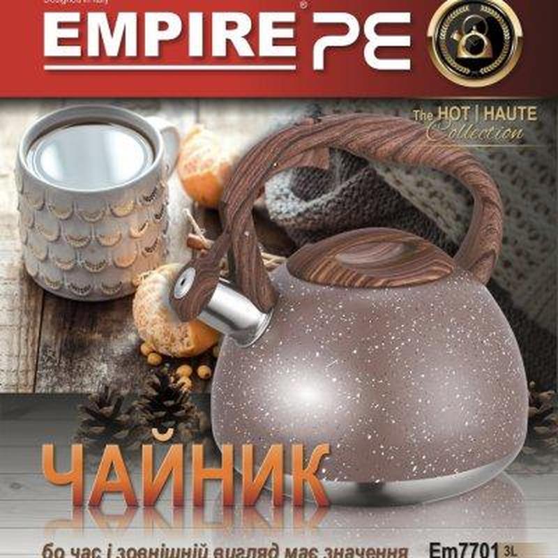 Характеристики: Бренд: EMPIRE Матеріал: Харчова неіржавка сталь Об'єм: 3 л Тип дна: Тришарове лите Колір: Коричневий граніт Діаметр верхньої частини: 9.5 см Діаметр дна: 16 см Висота з ручкою: 23 см Ширина з носиком: 23 см Кришка : Ебороніт дерево Ручка : Ебоніт нерухома дерево Свисток : Да Тип: плита Зберігання в холодильнику: Так Посудомийна машина: Так Паковання: фірмова коробка Країна виробник: К.Н.Р.