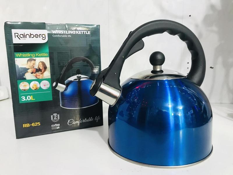 Чайник из нержавеющей стали со свистком RB-625 синий Чайник Rainberg RB-625 очень качественный и удобный. Чайник Rainberg является антибактериальным и имеет высокие показатели экологической чистоты. Даже через много лет этот чайник будет прекрасно выглядеть и сохранит свои свойства. Чайник Rainberg - это покупка, которая прослужит многие годы! Ручка в чайнике не нагревается, она выполнена из бакелита. Чайник оснащен свистком, который всегда напомнит о закипевшей воде. Он поднимается с помощью механического нажатия на специальный клапан. Подходит для газовых, электрических, стеклокерамических, галогеновых плит и можно мыть в посудомоечной машине Характеристики: - Чайник оснащен механизмом, вмонтированным в ручку, который позволит одним нажатием открыть или закрыть свисток; - Ручка - бакелит; - Можно мыть в посудомоечной машине; - Многослойное дно - Обьем 3л