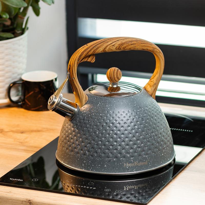 Чайник зі свистком 3 літри для плити з дерев'яною ручкою сірий з потрійним дном ku-22