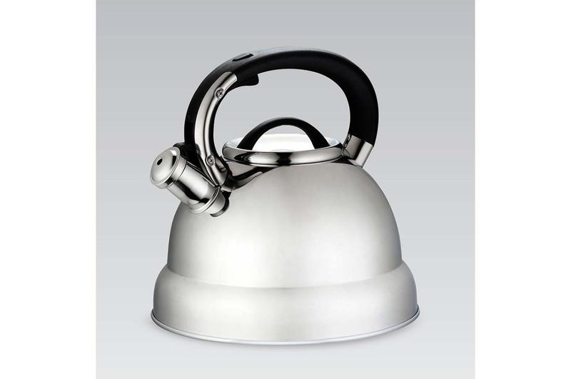 Чайник неіржавкий Maestro — 4 л виготовлений із високоякісної неіржавкої сталі з глянсовим поліруванням. Обладнаний клапаном-свиствком і важелем для безпечного відкривання/закривання. Одношарове індукційне дно.Крихітка чайника сталева з бакелітовою ручкою. Підходить для всіх типів плит, включно з індукційними.