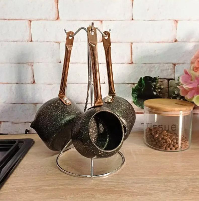Набір турків OMS 7220 Набір турків OMS 7220 виконаний з нержавіючої сталі, яка чудово утримує температуру і абсолютно безпечна для здоров'я. Кава, зварена в турці, відрізняється досить насиченим смаком і густою консистенцією з невеликою кількістю часток. (гущі). У напої залишаються майже всі речовини, що містяться в обсмаженому кавовому зерні. Приготування кави в турці - один із найдавніших методів заварювання кави, тому рецептів кави по-східному дуже багато: вони можуть відрізнятися і використанням додаткових інгредієнтів, самою технологією приготування та подачею кави. Характеристики: - Тип: набір турків - Матеріал: нержавіюча сталь - Матеріал ручки: нержавіюча сталь - Матеріал підставки: нержавіюча сталь - Можна мити в посудомийне - Виробник: OMS Комплектація: - Турка 250 мл: 1 шт - Турка 350 мл: 1 шт - Турка 500 мл: 1 шт - Підставка: 1 шт