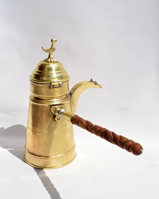 Антикварна турка, джезва - Далла. Зроблена відповідно до давніх сирійських традицій. Виготовлення турок у Сирії є мистецтвом, яке передається з покоління в покоління. Ремісники, відомі як "мідні майстри", використовують традиційні методи та інструменти для створення турок із міді та латуні. Вони вручну формують і прикрашають кожну турку, створюючи унікальні орнаменти та фігурки, які надають їм особливого східного вигляду. Присутнє тавро. Латунь, дерев'яна ручка. Чудовий стан для свого віку. Повністю функціональна, не протікає.