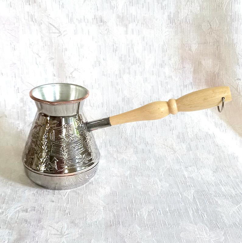 Турка мідна "Скарби" 400 мл (повний об'єм до країв) виготовлена з високоякісної листової міді завтовшки 1,2 мм. Усередині посуд покритий харчовим оловом товщиною 9-12 мкм, що оберігає мідь від окислення і робить виріб максимально безпечним для здоров'я. Харчовий припій оловом необхідний для того, щоб у каві не відчувався неприпустимий металевий смак (лудіння для джезви потрібно обов'язково, щоб не було хімічного процесу окислення та подальшого руйнування поверхні з міді). Внутрішнє лудіння виконується електрохімічним методом і олово на молекулярному рівні осідає на поверхні міді в чистому вигляді (Sn3). Зовнішнє покриття турки – "чорний нікель". Це поверхневе гальванічне покриття виконує декоративно-захисну роль і дозволяє виробу мати чудовий вигляд навіть після тривалої експлуатації. Довга дерев'яна ручка дозволить уникнути опіків; це особливо важливо для тих, хто готує каву на відкритому вогні. Виконана вона з вільхи, а зверху покрита вологостійким лаком. При перегріві ручка не відокремиться від виробу, оскільки вона відпресована на мідній трубці, а потім пропаяна за допомогою гвинтово-паєчного способу. Також на кінці ручки є скоба для підвішування турки. Короткі характеристики виробу: висота - 105 мм діаметр горлечка - 65 мм діаметр дна - 75 мм довжина ручки - 165 мм Мідь - найкращий матеріал для посуду, в якому готується кава. Адже мідь чудово проводить тепло, поступово розподіляючи нагрівання по всій поверхні посудини. Завдяки цьому ваш улюблений напій набуває повного, насиченого смаку та аромату, м'якої пінки та чудових підбадьорливих властивостей. Присмаку кави, що пригоріла, навпаки, вдасться уникнути. Рекомендації з обслуговування: використовуйте тільки миючі засоби з натуральних інгредієнтів без віддушки!