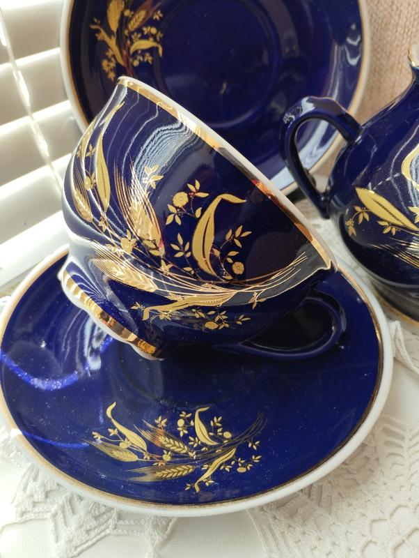 Сервіз чайник, цукерниця та 6 чашок з блюдцями . Стан - відмінний, некористований. Позолота ідеальна. Ціна вказана за чайник. Чайна пара - 350. Можна замовити окремо