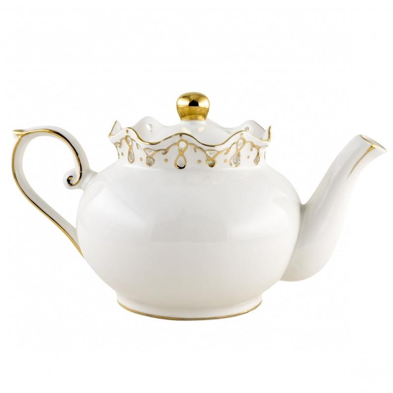 Фарфоровий чайник в класичному стилі. Прикрашений золотистими елементами, виготовлений з порцеляни. Матеріал відрізняється міцністю, механічною і термічною стійкістю, стійкістю до різних кислот. Фарфор виготовляють шляхом високотемпературного обпалення суміші каоліну, кварцу, польового шпату і глини. Чайник прикрашений вишуканим фігурним орнаментом золотистого кольору, який вдало виглядає на білому тлі. Всі компоненти порцеляни натуральні і абсолютно безпечні для здоров'я. Такий чайник відмінно доповнить святковий стіл.