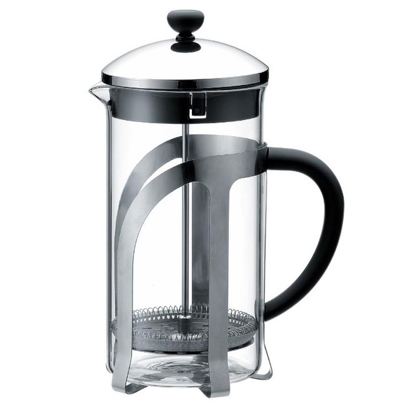 Френч-прес. Скляна колба надійно закріплена в підстаканнику з нержавіючої сталі. Кришка не нагрівається в той час, коли ви наливаєте гарячий напій в чашку. Ручка також виготовлена з матеріалу, що не нагрівається. Френч-прес має сучасний дизайн і високу ергономічність. Каву у френч-пресі заварювати зовсім не складно. Ось як це робиться. Для початку споліскують колбу френч-преса окропом, витирають насухо, і засипають каву. Заливають водою з температурою близько дев'яноста градусів. На поверхні утворюється пінка. Каву швидко розмішують дерев'яною або пластиковою ложкою. На пінку акуратно опускають нижню частину поршня та закривають кришку. Настоюють каву чотири хвилини, потім опускають поршень. У френч-пресі зручно заварювати не тільки каву, але й чай. Для цього потрібно сполоснути його окропом, потім засипати заварку і залити її водою потрібної температури, в залежності від виду чаю. Цю воду прийнято зливати. Почасти це роблять з метою гігієни, частково для того, щоб оживити чай. Це справа смаку. Наступну заварку настоюють від декількох секунд до декількох хвилин. Час залежить від виду чаю та індивідуальних переваг. Потім роблять кілька рухів поршнем вгору-вниз. Тепер чай можна пити.