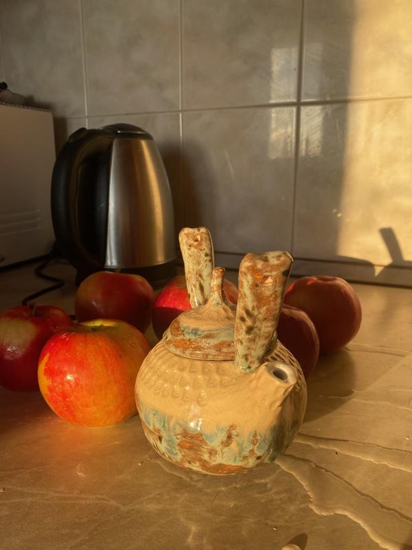 Маленький керамічний чайничок ручної роботи у китайському стилі, приблизно на 300 мл із деревяною ручкою (гілка карпатська) мкф глина, різні глазурі