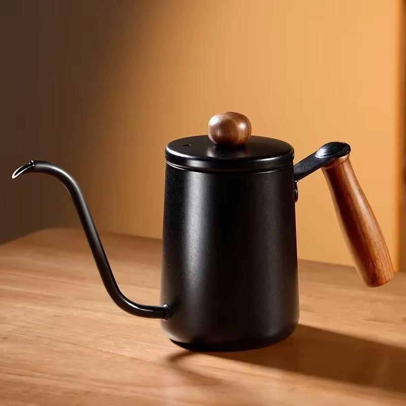 Стильний металевий кавник з нержавіючої сталі об'ємом 600 мл для приготування кави та чаю. Кавник з довгим носиком стане вашим незамінним помічником. На відміну від своїх аналогів, кавник виготовлений з високоякісної сталі марки 304, що гарантує його надійність і довгий термін служби.\ Чайник має спеціальний довгий та вузький носик для повного контролю потоку гарячої води. З його допомогою, ви отримуєте цілісний струмінь, максимально можливу щільність і товщину, прийнятну для заварювання кави в пуровері. Кавник має ручку (волоський горіх), яка не нагрівається і не ковзає в руці, захищаючи тим самим Вас від опіку. Кришка має спеціальні фіксатори, завдяки яким щільно закрита. Дуже цікавий аксесуар для приготування кави альтернативним способом. Більш зручного і простого пристрою для дозування кількості води при заварюванні кави складно собі уявити. Цей аксесуар дозволяє доставити потрібну кількість води саме туди, де вона потрібна. Характеристика: - Матеріал: Нержавіюча сталь - Колір: Чорний; - Ручка: Грецький горіх; - Розмір: 14.5 см x 28 cм; - Місткість: 600 мл; - Сталь: S/S 304.