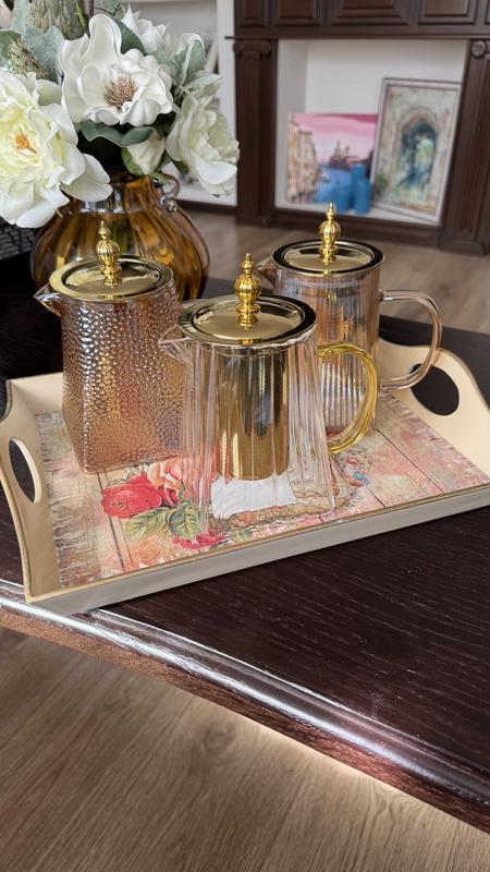 Чайники заварники із металевим фільтром поєднання рефленлго скла і золотистого металу виглядає просто розкішно обʼєм 750мл ✨прозорий | 365грн ✨амбер полоска | 390грн ✨амбер 2 фото | 380грн