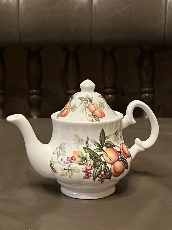 Міні-чайник “Fruits & Vines” — Marl Bone China, Wales Вишуканий мініатюрний чайник із кістяної порцеляни (Bone China) від Marl, Wales — яскравий приклад класичного британського фарфору другої половини XX століття. Прикрашений детальним фруктово-ягідним декором із персиками, виноградом і листям, нанесеним підглазурним друком із ручним підфарбуванням. Компактна форма з хвилястим рельєфом і витонченою ручкою робить його привабливим не лише для чаювання, а й як декоративний предмет для колекцій English Cottage Style. Характеристики: • Об’єм: 250 мл • Розмір: 11 × 15 см • Матеріал: Bone China (кістяна порцеляна) • Виробник: Marl, Wales • Маркування: MARL BONE CHINA WALES • Стан: відмінний, без сколів і тріщин Особливості: • Традиційний англійський дизайн “Harvest Fruit” • Тонкий блиск кістяної порцеляни • Ідеальний для колекціонерів або як декоративний акцент на кухні чи у вітальні