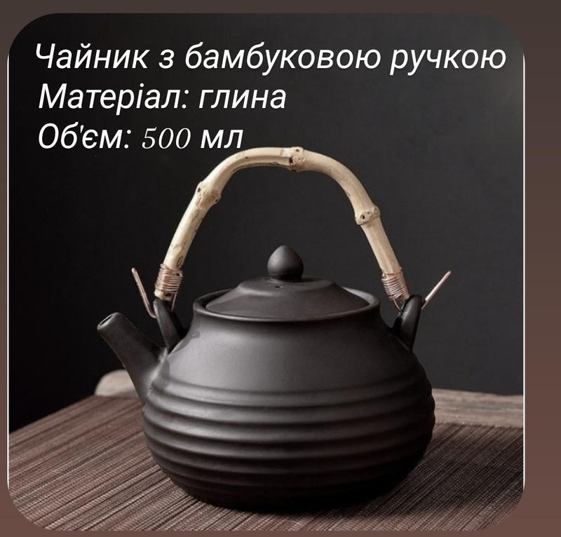 Чайник із бамбуковою ручкою "Хвиля" чорний 500 мл. Сиробник: Коста5 Вага: 320 г Довжина: 14 см Ширина 12 см Висота 9.5 см Maтеріал Глина