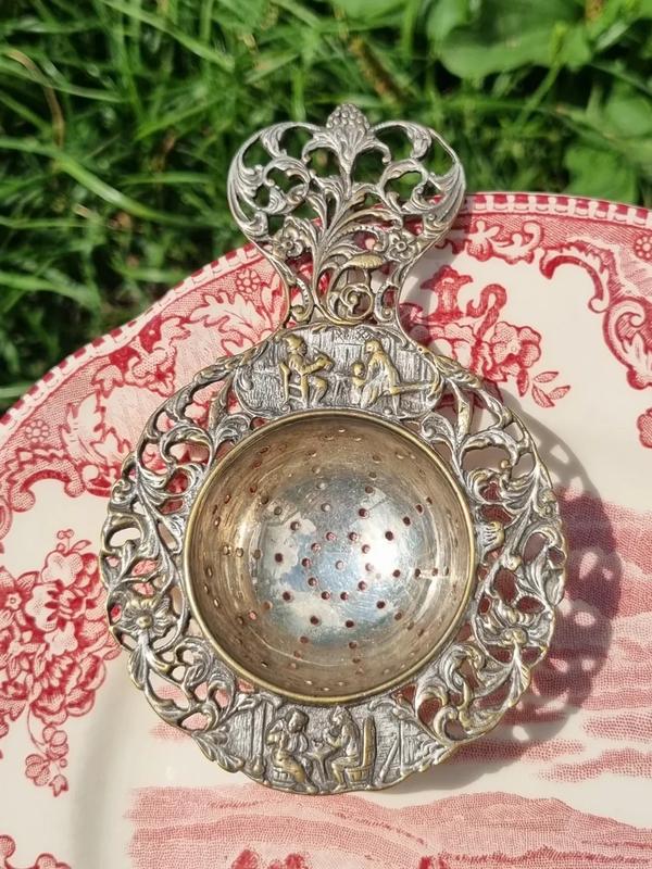 Антикварная чайная сеть с великолепным изысканным узором и интересной сюжетной сценой. Англия, начало XX века. Латунь, остатки серебряного покрытия. Хорошее состояние, присутствуют потертости серебряного покрытия.