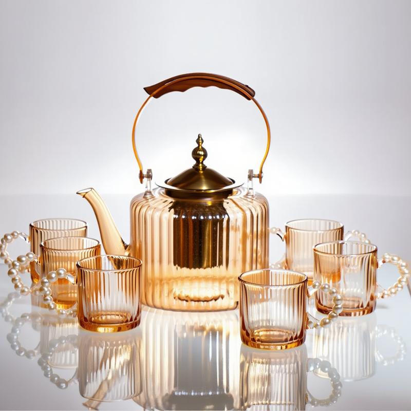 Набір для заварювання чаю зі скляним чайником і шістьма чашками створений для тих, хто цінує естетику у кожній деталі. Чайник об’ємом 1 літр має металевий фільтр, кришку та ручку -- поєднання скла й металу забезпечує міцність і довговічність, а також дозволяє зручно заварювати різні сорти чаю без осаду. Прозоре скло дозволяє спостерігати за процесом заварювання, що робить чаювання ще приємнішим. Шість скляних чашок з об’ємом 120 мл доповнюють набір. Їхні ручки у вигляді перлин надають оригінальності та роблять тримання зручним і безпечним навіть при гарячому напої. Невеликий розмір чашок ідеально підходить для ароматного зеленого, трав’яного або чорного чаю. Завдяки поєднанню елегантного дизайну та практичності цей набір стане чудовим доповненням до вашої кухні або приємним подарунком для любителів чаю. Він підходить як для щоденного використання, так і для особливих моментів у колі близьких. Характеристики: Матеріал: скло, метал Об’єм чайника: 1 л Висота чайника: 16 см Діаметр чайника: 13 см Комплектація: чайник із металевим фільтром, кришкою та ручкою + 6 чашок Об’єм чашки: 120 мл Висота чашки: 6 см Діаметр чашки: 5.5 см Форма ручок: у вигляді перлин Призначення: для заварювання та подачі чаю Кількість предметів: 7