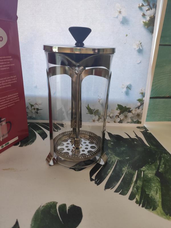 Колба термостійке скло Поршень нержавіюча сталь Підставка нержавіюча сталь Ручка бакеліт Об'єм 600 мл