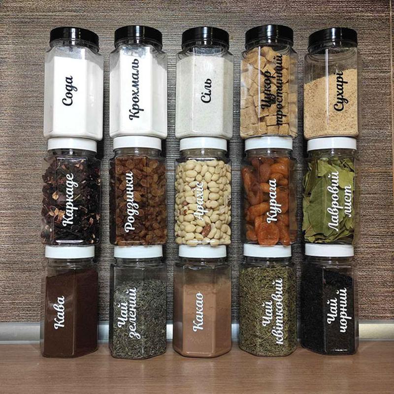 Набір складається з 15 ємностей об'ємом - 450 мл. Розміри: Висота 14 см Ширина 7,5 см Форма: шестигранна Матеріал – харчовий пластик (ПЕТ 1) Колір кришки – чорний, білий. Варіанти написів: Арахіс Глазур Горіхи Желатин Ізомальт Каркаде Какао Кава Курага Кокосова стружка Кіноа Кунжут Крохмаль Крохмаль кукурудзяний Крохмаль картопляний Лимонна кислота Льон Лавровий лист Приправа універсальна Паніровочні сухарі Родзинки Рис басматі Сіль Сода Сухарі Чай зелений Чай квітковий Чай чорний Чай фруктовий Цукрова пудра Цукор Цукор тростинний Цикорій Не знайшли потрібний напис? Просто напишіть нам і ми втілимо Ваші побажання у життя.