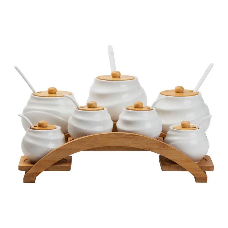 Набор баночек для сыпучих продуктов выполнен в изящном белом цвете и станет стильным и функциональным дополнением к любой кухне. Каждая баночка оснащена удобной бамбуковой крышкой, которая обеспечивает надежное хранение продуктов и сохраняет их свежесть. Комплект включает: Три баночки объемом 500 мл Четыре баночки объемом 200 мл Каждая баночка дополнена ложечкой, что позволяет легко дозировать сыпучие ингредиенты. Бамбуковая подставка организует расположение баночек и подчеркивает натуральный и элегантный дизайн набора. Характеристики: Материал банок: Керамика Материал подставки: Бамбук Объем баночек для специй: 0.5 л / 0.2 л Этот набор сочетает практичность и стиль, делая его превосходным выбором для любой кухни.