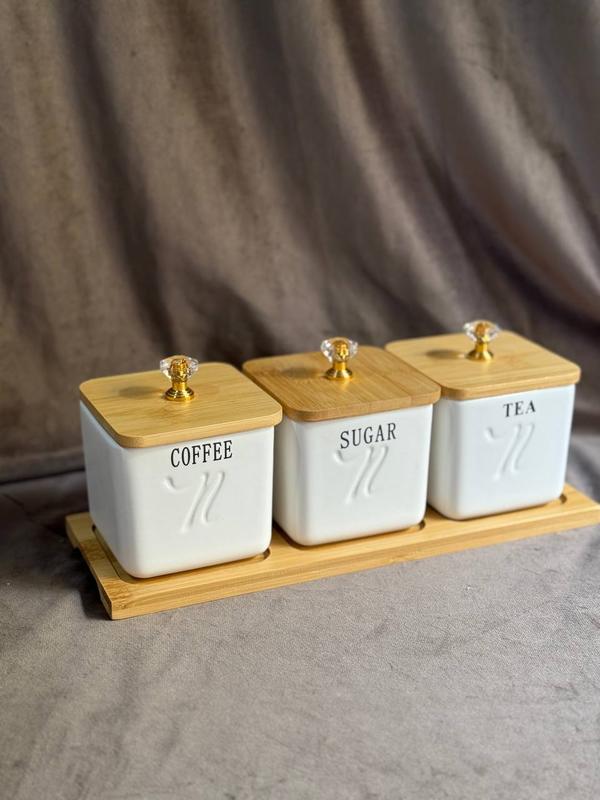Набір банок для сипучих продуктів Yiwu SCT-643 кераміка на бамбуковій підставці 3 шт по 500 мл Білий